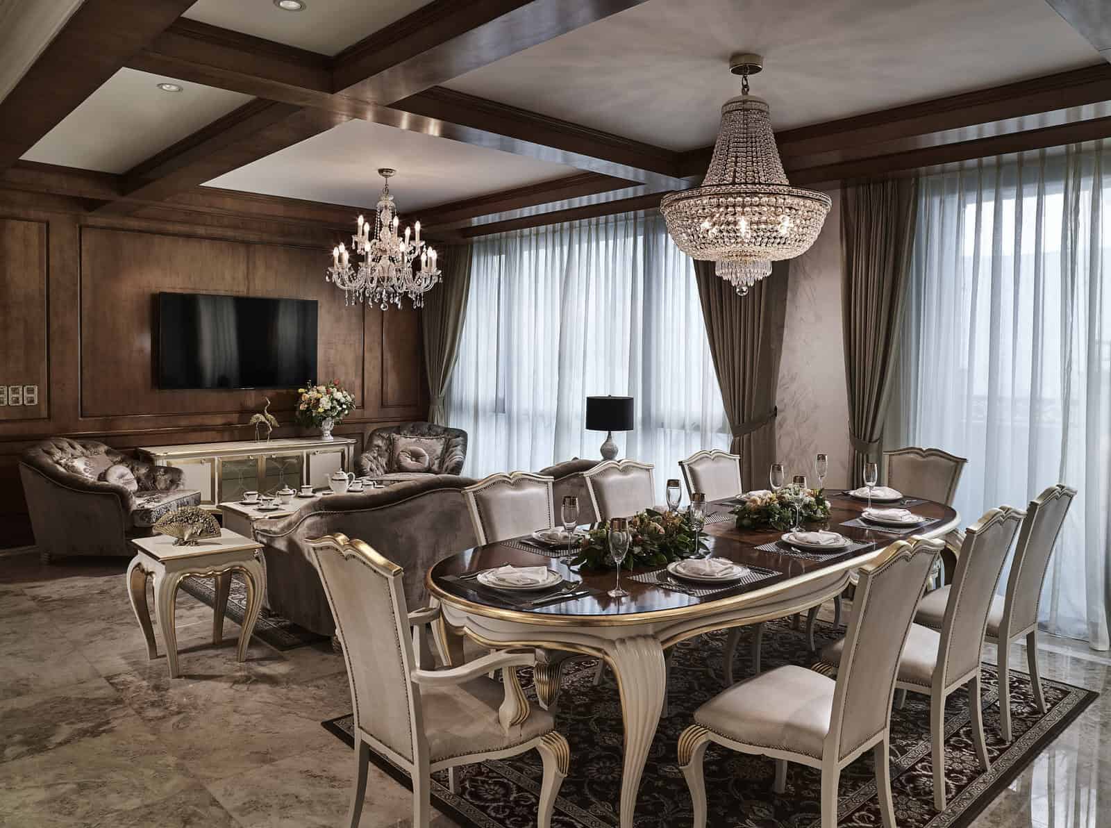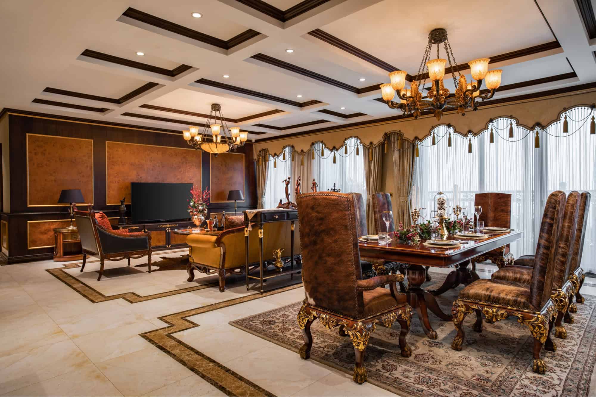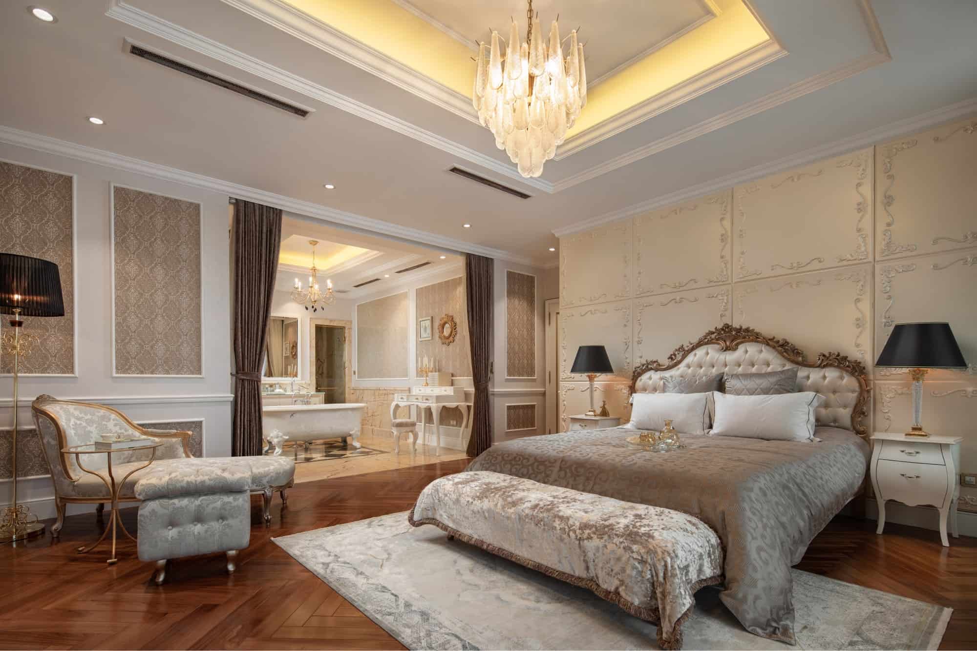 Được thiết kế với các hoạ tiết tân cổ điển theo phong cách hoàng gia, cách xử lý nội thất thể hiện dấu ấn thời gian có chủ ý, dinh thự hiện lên với dáng vẻ quá khứ đầy quyền lực với thiết bị đến từ thương hiệu nội thất nổi tiếng Dragan, Ý.